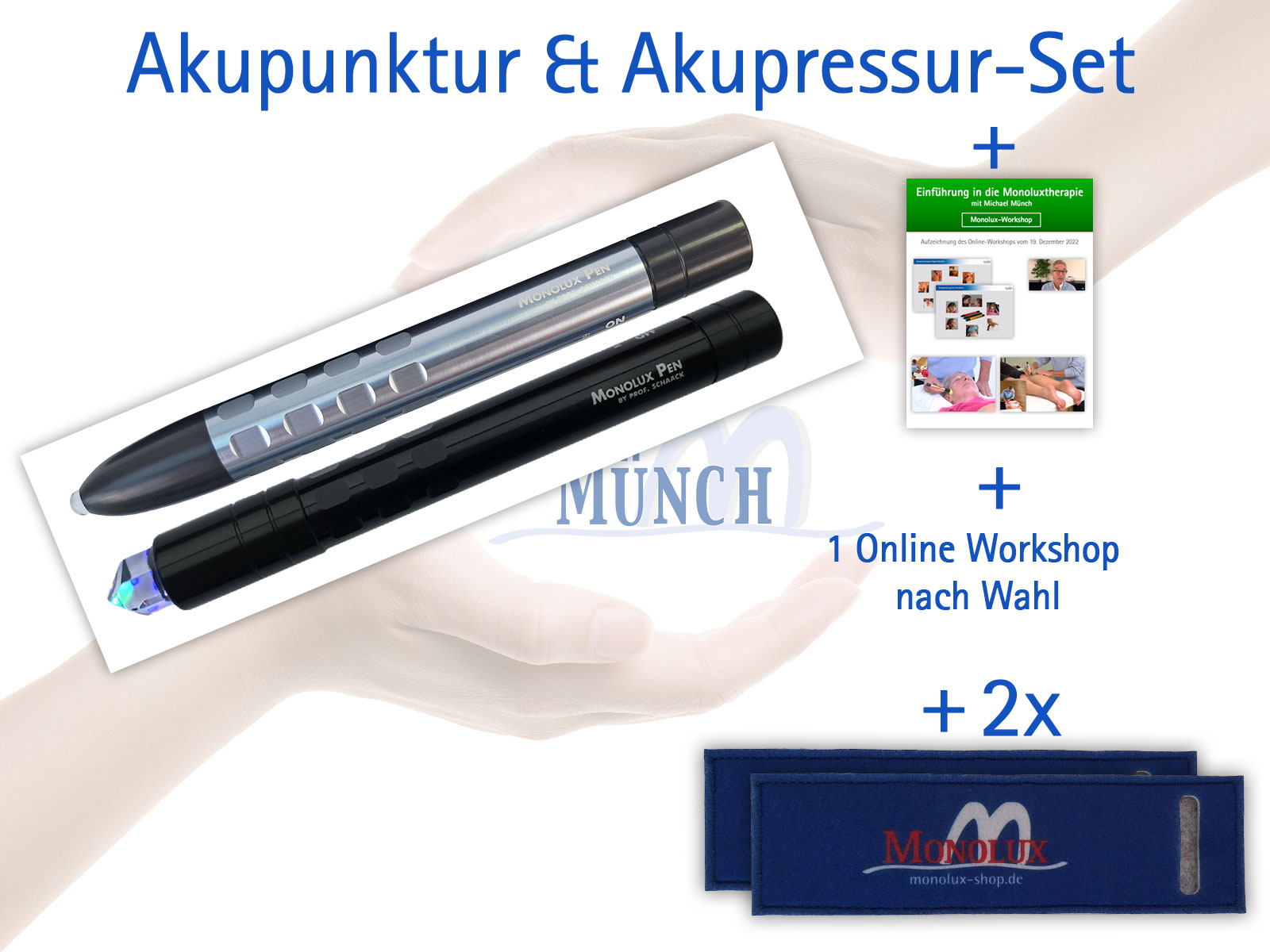 Das Set enthält einen Monolux Pen Bergkristall Spitz + einen Monolux Pen Acrylkopf eisblau + 2 Etuis (435€ +325€+10€) statt 770 € – 699 €. Zusätzlich erhalten Sie zu diesem Set ein Einführungsvideo in die Monoluxtherapie und einen Gutschein für einen weiteren Online-Workshop nach Wahl (Wert je 39,-€).
